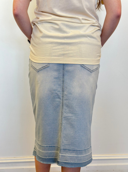 The Hailey features stretch denim calf length pencil skirt with a button/zipper closure, pockets on the front and back, no slit, released hem.