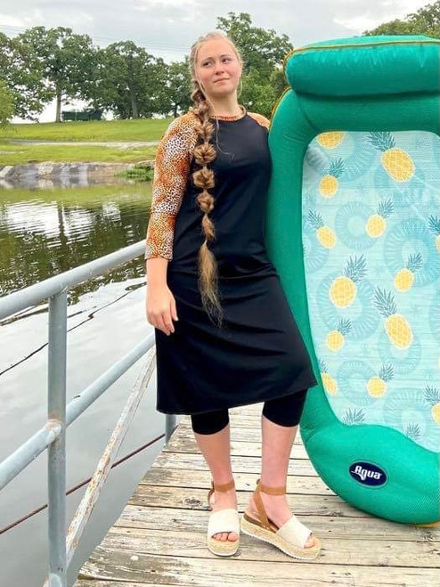 Our modest swimwear is a must have for the summer! This straight sheath style is figure flattering and comes in a variety of fun prints! Easily go from swim to window shopping in this adorable vacation ready style!